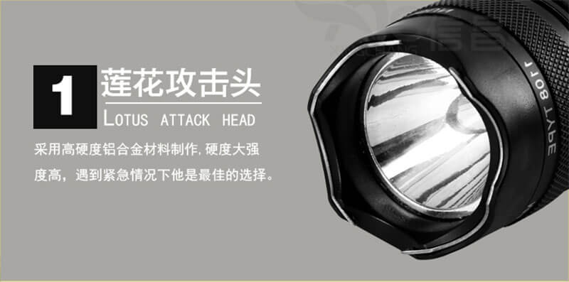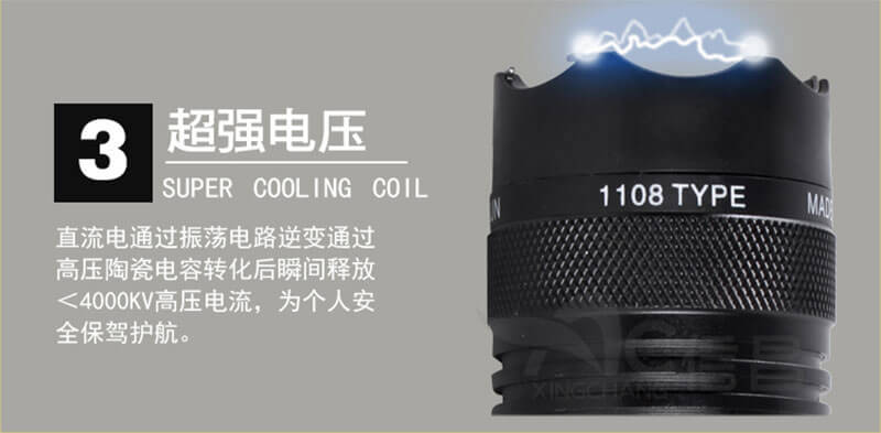 2、电击头采用莲花头电流输出平缓稳定持久、高密度橡胶安检耐用程度提高100%、超强的100万伏输出电压穿透力更强、手柄处采用防滑处理防止抢夺